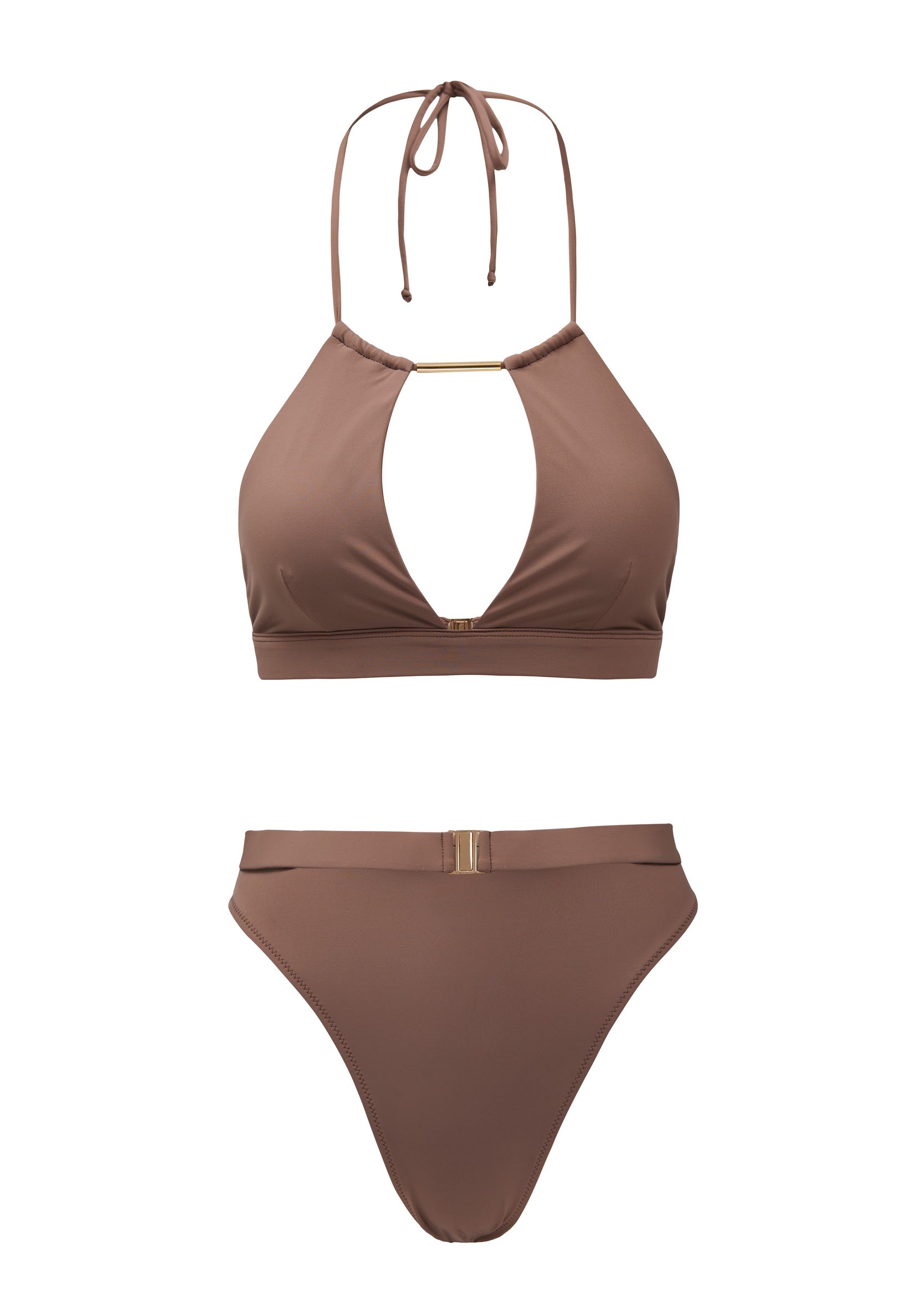 The Gaia bikini has a halter neck feature with luxurious details such as golden hardware and extremely soft fabric. The color equator is a beautiful natural dark brown tone perfectly combined with a golden brass tube detail along the neckline. This beautiful brown bikini top has a golden buckle closure and halter neck ties. It is extremely flattering for all bust sizes and makes a classic look for a day on the beach.