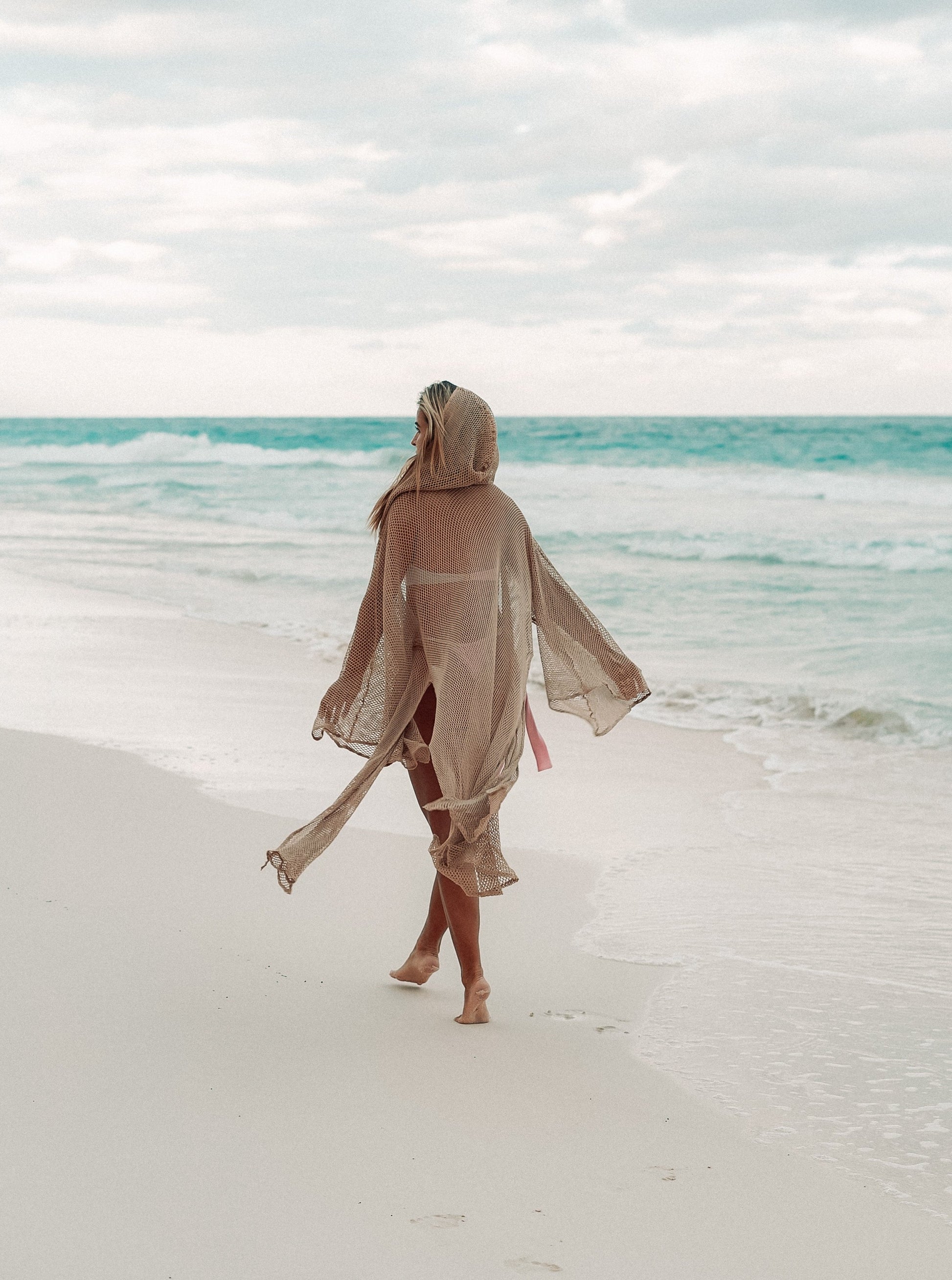 The Nomade Kimono is made from one of a kind fish net fabric creating a mermaid like look and perfect to match over a bikini or swimsuit. The design makes it flow in the wind and creates extraordinary shapes reminding us of a bohemian experience. Nomade comes with super sized flared sleeves, double leg splits and a oversized hoodie. It also comes with a belt for more structure around the hips. Be sure to stand out and make waves with this flowing, lightweight and eye catching Kimono.